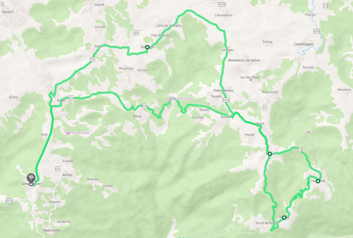 Parcours :  Sengouagnet / Aspet / Col de Larrieu / Arbas / Fougaron / Herran / Arbas / Estadens / Pujos / Aspet / Sengouagnet. (48kms environ)